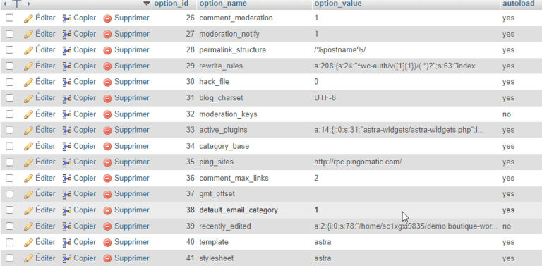 - Cette table « Options » contient des réglages importants de WordPress, des thèmes et des plugins (qui peuvent aussi stocker d’autres données dans d’autres tables)